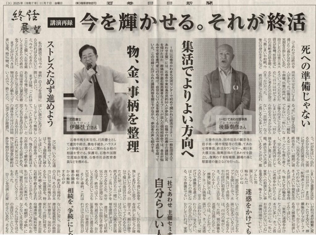 石巻で開催された終活セミナーの様子が、石巻日日新聞で紹介されました。